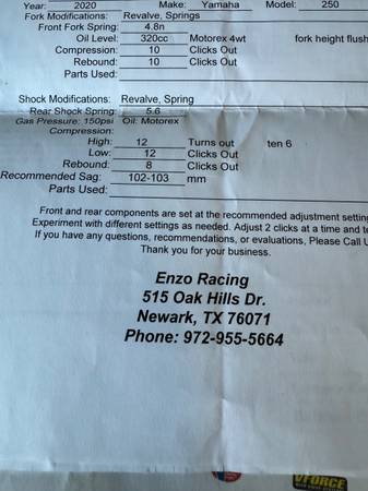 2020 YZ 250. In great shape. 36 total hours. Top end has 21.5 hours on it. Cylinder and head was ported and polished by Tom Morgan Racing. Suspension done by Enzo Racing. Pro Circuit exhaust. ARC levers. VROCE 3 Reeds,Excel wheels. Like new Dunlop tires front and rear. Bike well maintained and ready to ride.Clean title in hand.