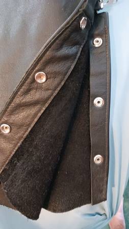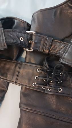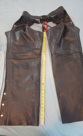 A nice pair of leather riding chaps by Eagle. Size XL. The picture with the size chart is waist, thigh, inseam. 80.00. excellent condition.