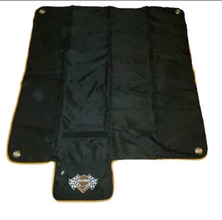 This is a Harley-Davidson roll-up nylon/fleece travel blanket with grommets on all corners, handle and zippered pocket. It is a black with orange trim and embroidered Harley-Davidson logo on. It is water resistant nylon with fleece-lining on one side making it suitable for use as a travel blanket or a tarp. The blanket is designed to be rolled up and secured with a strap or velcro for easy transport.