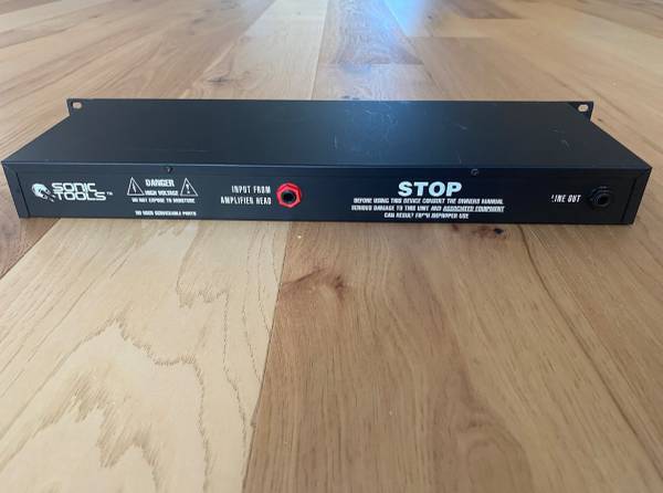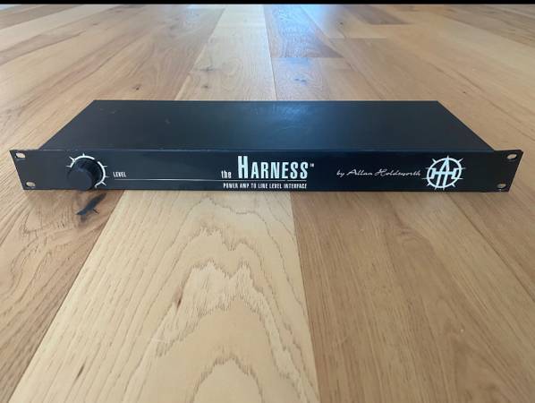 "The Harness", Version 1, power amp to line level interface, hand made by Allan Holdsworth in the mid 1990's for sale. Second owner. Kept in my home studio only. This modern version was designed for use with high gain/master volume amplifiers like Mesa Boogie etc. This reactive load lets you push your amp volume higher, yet by reducing the signal to line level you can achieve maximum saturation at a lower volume. Allan also hand built the "Harness Il" version for "Vintage"non-master volume amps like older Marshall and Fender amps. THIS UNIT LISTED FOR SALE IS DESIGNED TO BE USED WITH MASTER VOLUME AMPS ONLY!