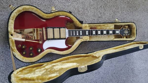 Plays great with fantastic low action. Great condition. Based on a unique special order variant 1963 Custom SG. Waffle back tuners are a nice add to this one. Picture has witch hats knobs added, but i have original gold top knobs. Some wear on the gold plating on the bridge and slight wear on pickup top edge. Comes with nice hardcase and COA. Cash, local pickup, No trades.