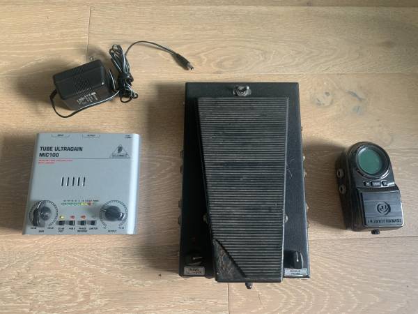 Pedal purge! Still available unless SOLD noted- Morley slimline SLMC-4 Volume pedal $75 Behringer Ultragain MIC 100 tube pre-amp $50 Planet Waves guitar/bass tuner $30