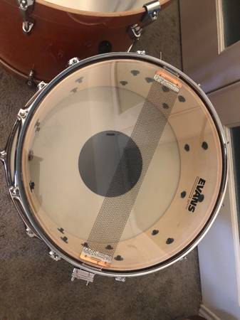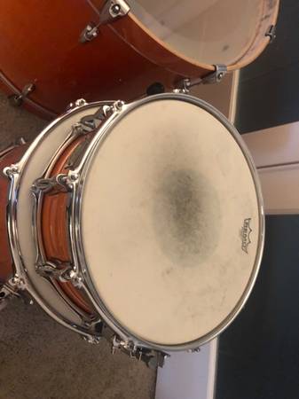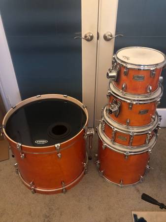 For sale is a 5 piece stage custom in honey amber. A few scuffs on the floor tom and kick drum, and the batter side kick hoop has some markings from where the pedal was attached. Otherwise good condition. Heads are not stock.