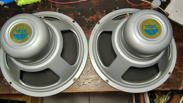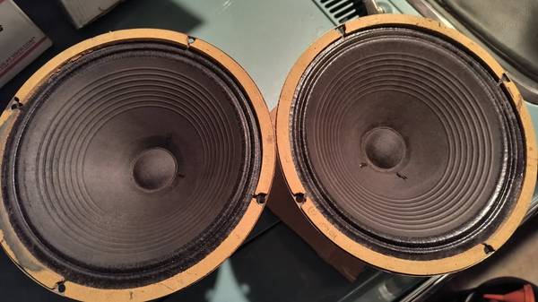 Pair AlNiCo Silver G12 T1088 15 or 20-Watt 8-Ohm. Date code GM (July 1967), original 102-003 Pulsonic cones in good shape. Pulled from a '60s Vox amp. No buzzing, no rubbing, no repairs, just a good solid pair of classic speakers. $1100.