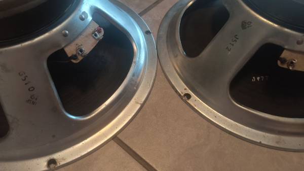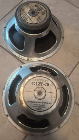 Pair of early G12T-75 speakers with vented magnets. The original 1777 cones are in good shape. Fully tested, both with a signal generator, and with a guitar thru an amp, all in proper working order. See pics for cosmetic condition. $250.