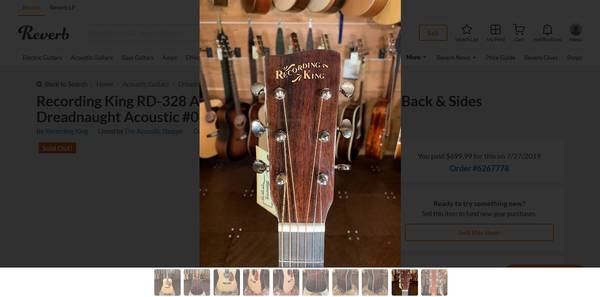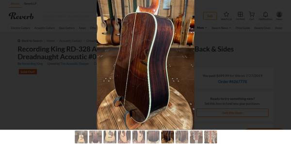 Recording King RD-328 Solid premium Adirondack Spruce top, this first year or two the Adirondack Spruce was stated to be 30 years aged (these are the giant logs they had somewhere up in the northeast USA, there were photos of the logs raised off the ground some with tarps over the top, they cut tops or sell lumber to guitar companies, tonewood suppliers or luthiers. Back and sides of AAA grade solid East Indian Rosewood. This is a great guitar, was received by a dealer who RK wanted to bring into their dealership line-up. I got this in 2019 from that shop, probably one of the first of this model sold. Excellent bass to treble and deep tone, the tone reminds me of a D-35. Low action with nice high saddle. No fretwear. Mint condition with a hardcase that is also like new or close to new. Come and get it before I start playing it again then won't want to sell it.