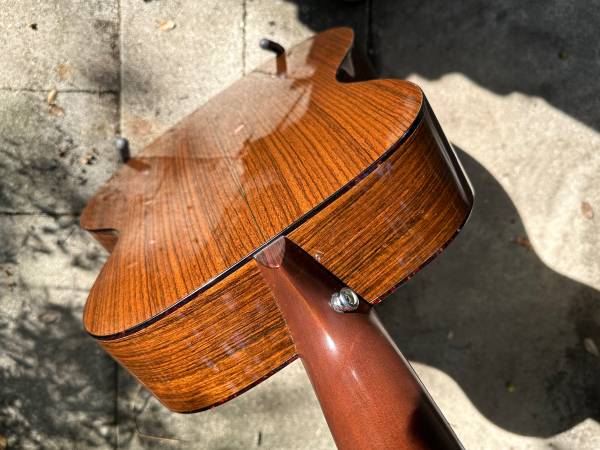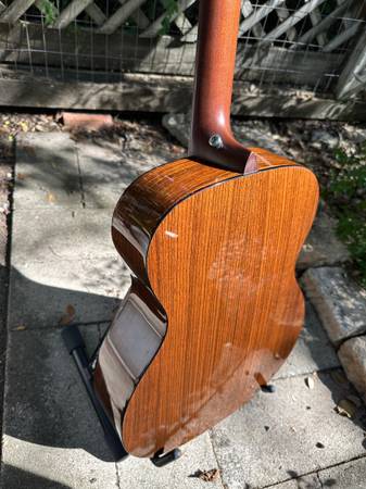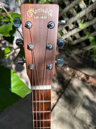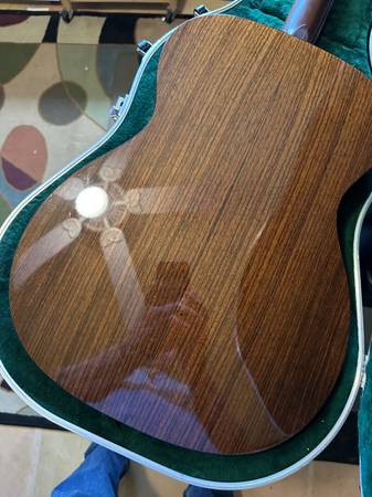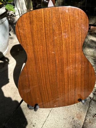 Very similar to Martin OM-28 except for the white bindings and strip inlay. All woods and hand scalloped foward shifted bracings are the same. Solid Rosewood back and sides. Solid Sitka spruce top. Took some pictures outside to show how beautiful the wood and great aged top look in the direct light. Save yourself lots of money but still get the Martin quality and sound. Sells for $3000 new plus pickup and tax.