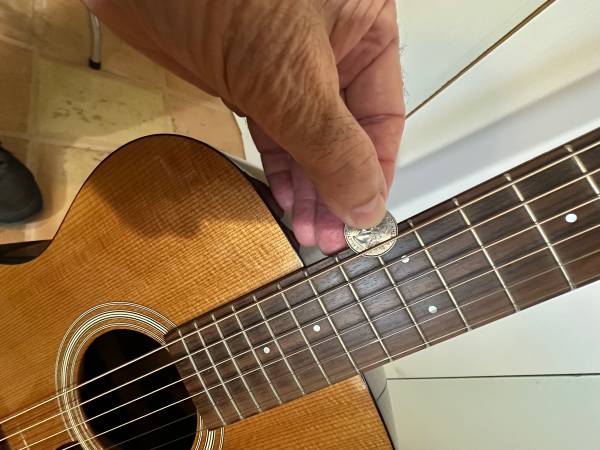 Guitar is set up to play easily and in tune all the way up the neck with no buzzing. There is a U S Quarter barely clearance on bass side and barely touching on treble side at the 12th fret. See pictures. The strings are Elixir Nanoweb 12 to 53. Phosphor Bronze.