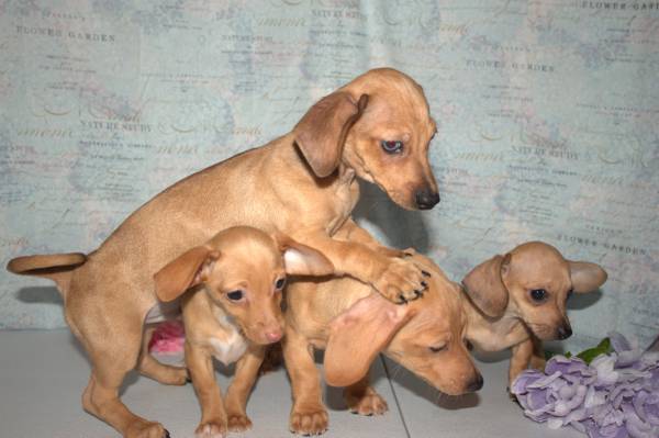 Say Hello to the cutest puppies you will ever see! Beautiful 12 week old Mini Dachshunds, Buttercup, Tallulah, Cherry, and baby brother George Jr. 3 Female 1 Male. These adorable baby dogs are looking for their forever home. So cute, friendly and ready to be yours. They have had their first 2 rounds of shots and deworming. Next round due next week. Super Small. Dad weighs 12lbs and Mom weighs 8lbs. Rehoming fee will apply. Text: 5 one 2 52 nine four three eight 2 or email: zeyosllc@gmail.com