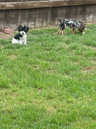 1 is a Blue Merle (1 year old male), 1 is a Parti (Black and White, 1 year old female) and the other is a cryptic merle (almost 2 years old female) with two blue eyes. My 2 puppies (one 5 month and the other 8 months) are both traditional male Yorkies (Black and Tan).