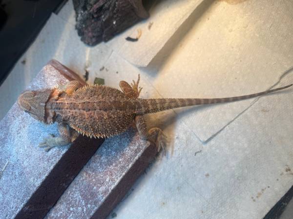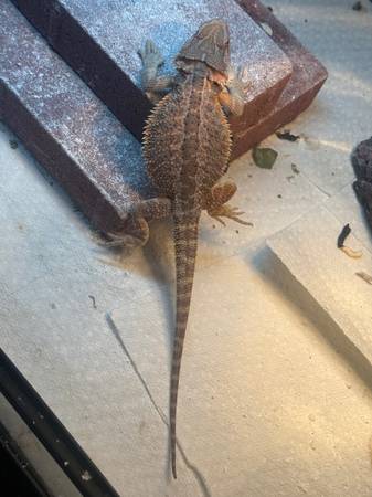 around 5 month bearded dragon . I got too many animals and need to get rid of some . Will be a few for rehoming , he only comes with some stuff - no tank .