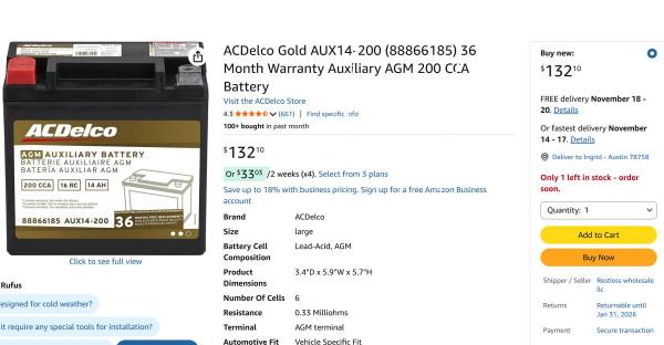 AC Delco Auxiliary Battery-BRAND NEW! 200 CCA - 16RC - 14AH - #88866185