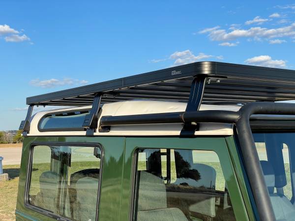 Land Rover Defender roof rack (used) by Frontrunner. These racks are made of aluminum, powder coated black and I am also selling the ladder with it (see links below). Rack was never used, just mounted to vehicle and removed after 2 weeks because vehicle sold. This roof rack was modified to fit both NAS and ROW Defender 90s