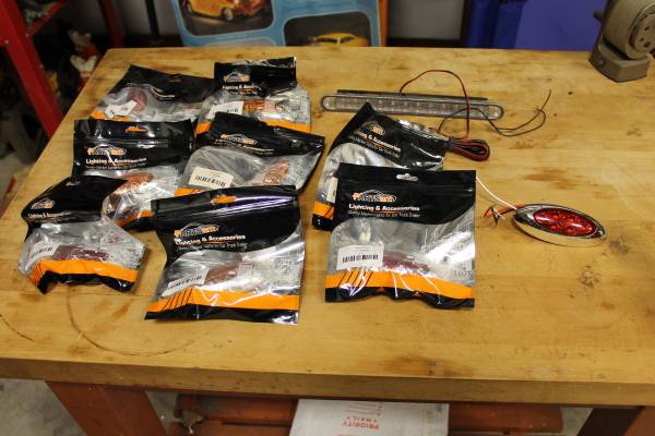 I have LED running lights . They are about 3 inches long and about 1 inch tall . I have 4 red lights and 2 amber lights . $12 each or $50 for all 6 . I also have LED brake lights . they are about 10 inches long . One with clear lens . One with red lens . They both glow red . $20 each . I have a 6 inch rectangle LED flood or overhead light . $25 . I will also make a package deal for everything