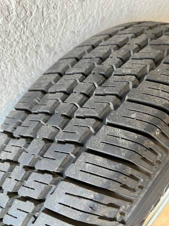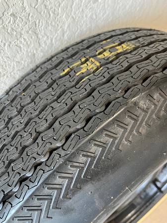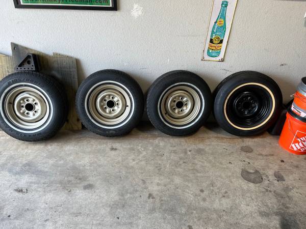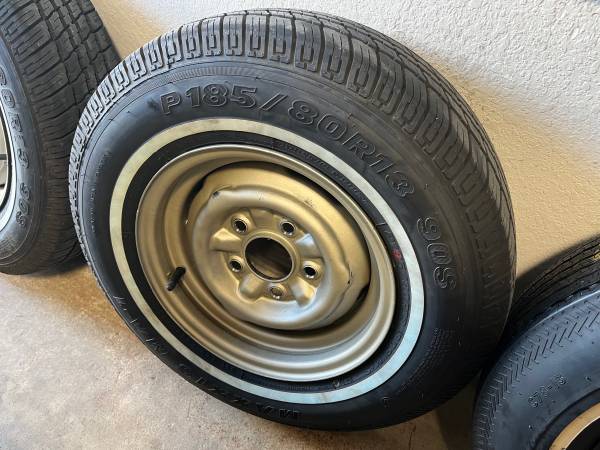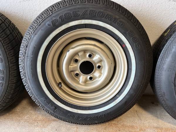 13” Corvair wheels and tires. 5 total. One tire is not show (it is in my trunk as spare temporarily) Brand new Maxxis whitewall tires with less than 200 miles in them. Rims have been cleaned, wire brushed and painted. The black spare is the original tire, never been used from 67. Very rare to have a glass original spare. Tires alone are $160 each. Pick up only north of Austin.