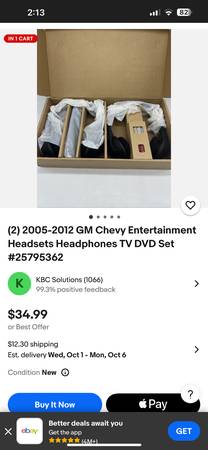 2) 2005-2012 GM Chevy Entertainment Headsets Headphones TV DVD Set #25795362. Brand new never taken out of box. I actually have two sets. Each set is $15.00. On eBay for $34.99.