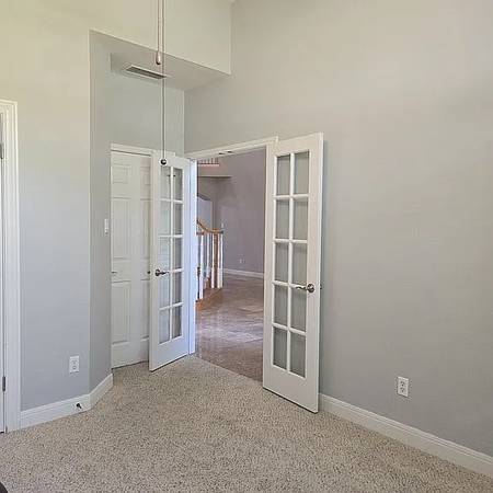 The downstairs primary suite offers large bay windows, a spa-like bath, and a spacious walk-in closet. With two stairways, the layout provides easy access from multiple points of the home, ensuring functionality and flow.