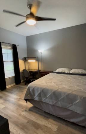 Downstairs master suite w/walkin closet and private bath. Fully furnished: cali king bed, tv, desk, fridge and microwave. Private patio access. All bills paid, wifi, and basic cable. Separate temp control. Gated townhouse community with gym, hot tub and pool. No access to rest of the condo unit. Laundry offsite. Parking on right side of driveway.