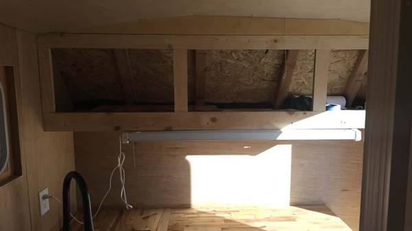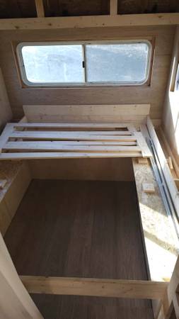 Fully rebuilt 14 foot travel trailer. Built from bones up, everything new except for actual trailer. Comes with 33 g water tank, water heater, and water pump which supply water to sink and shower. Stainless steel sink. Thick birch butcher block counters. Durastall shower. Fully plumbed with gray water tank hookup. Brand new deep cycle marine battery which powers inverter for lights and outlets. City power hookup on outside. Fully functioning turn, stop, and warning markers. Queen size bed frame with storage which can be converted into living space. Exterior tongue and groove cedar planks. Inside needs some light finishing work. Have awning that matches tires and original exterior and blinds which match windows. $6000 OBO