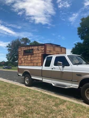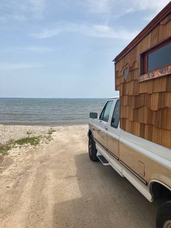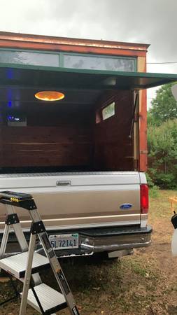For sale, one of a kind shingle sided camper mounted on the back of a 2013 F250. Great for road trips, camping and festivals. It’s the coolest thing on the road!