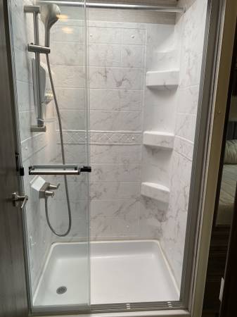 The bathroom is clean and functional, with a decent sized shower and sky light for extra head space. The toilet, and sink are in a separate water closet with a medicine cabinet, vanity and drawers.