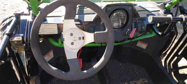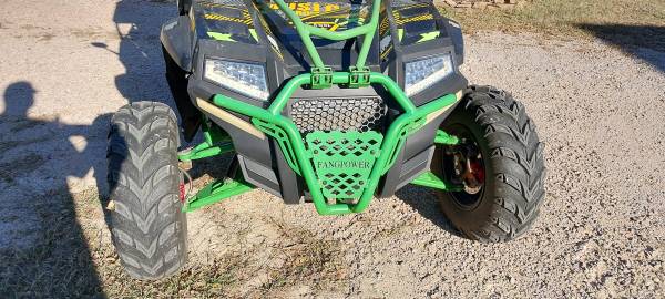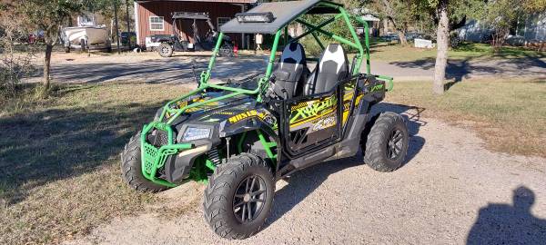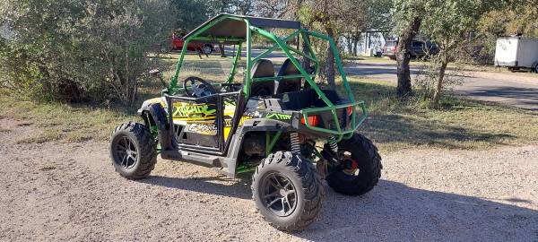Almost like new, with only 122 Killometers (78 miles) on it! It is barely broken in. Runs great. Just too small for me. It would make a great ride for the grandkids. It has a full roll cage and. seat belts! It is made for the trails and has a wicked suspension system that is adjustable for the weight or ride. Speedo goes up to about 45 MPH, and it feels easy to drive. It just had all fluids changed out and a new battery installed. It has sat most of its life. I am 2nd owner and it is just too hard for me to get in and out of it. Everything works like it should. Call or text 512 seven 55 five 495. 3,400 or best offer!