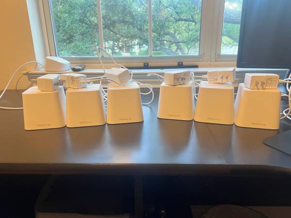 Meshforce M1 Wifi Mesh with 6 units. If you're having internet dropouts in areas and need to extend your network, this is the Wifi system for you. 6 units, with ethernet outputs so you can "hard...