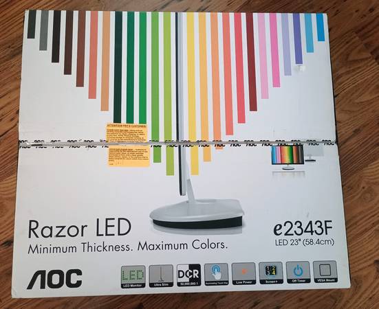 23-inch AOC Razor E2343FWidescreen LED LCD Monitor Quick Guide User Guide and Monitor Driver on CD VGA cable DVI cable AC Adapter (Input: 100 - 240V, 1.3A, 50/60Hz, Output: 12Vdc, 3.0A) Power cord...