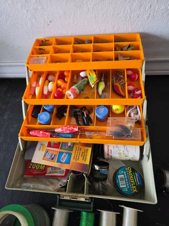 Price is for all. Don't want to separate Fish-n-mate fishing pier cart 1 rod and reel combo Vintage rebel 600 tackle box filled with lures plastics weights and more. Vintage Fishing net