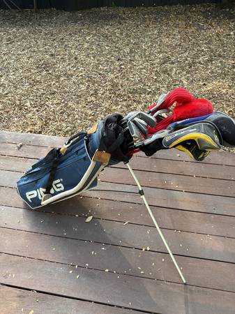 I am selling a full set of clubs. Includes Ping driver, King Cobra woods (plus 3 extra woods), Odyssey putter, and a 52 degree wedge. Missing 5 iron. Includes light weight Ping golf bag w/ stand and shoulder strap.