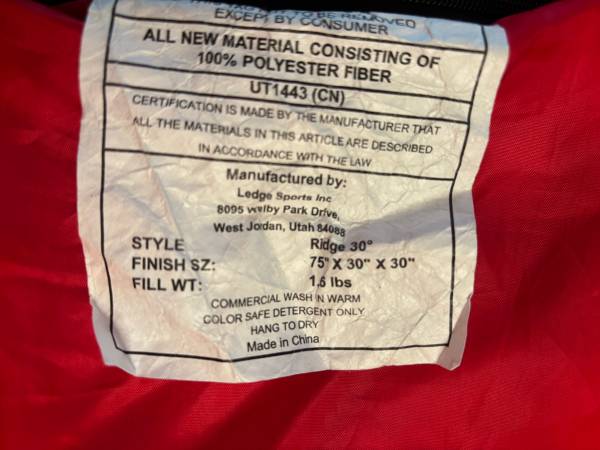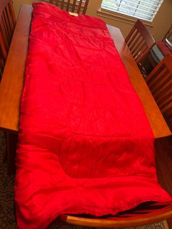 Full-size red sleeping bag (75” x 30”). Perfect for camping—super comfy and lightweight (1.6 lb). Used only once for a sleepover. Comes from a clean, smoke-free, pet-free home. Just clearing out...