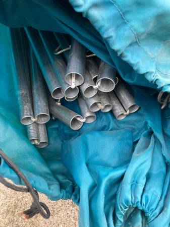 Got this tent from my parents and I’ll never use it. All the poles are there and it sets up really quickly. I don't have many details on it and I don’t feel like setting it up to confirm things like dimensions. I know it was always well cared for. Come pick it up, it's FREE!.