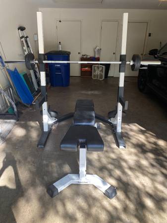 Nautilus adjustable weight bench with rack and York weights. Weights included are 2 at 25 lb, 4 at 10 lb, 4 and 5 lb, and 2 at 2,5 lb.