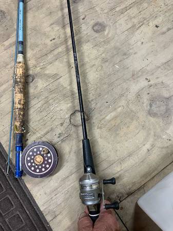 2 fly rods and old pistol grip light rod with Zebco light reel. Blue flyrod is True Temper Royal. The other is not marked.