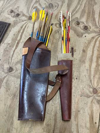 For both Quivers and wooden arrows. Big quiver marked Ben Pearson. Some arrows have non mechanical arrowheads all for $30