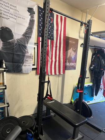 Rogue monster lite rack with dual J-cups. Pull up bar is the top support. Only selling to make room for a new stacked weight rack.