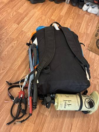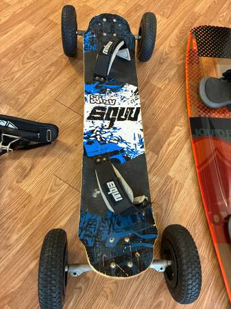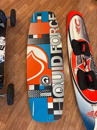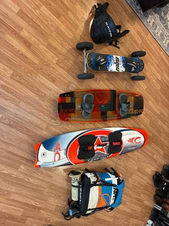 From left to right: Size medium Dakine Harness for Kiteboard, MBS Atom 95 Mountainboard, 142cm Liquidforce LFX Kiteboard with luxury footstaps, Cambria- DoubleAgent convertible twin board 180cm asymmetrical, Liquidforce Envy 12 meter kite.