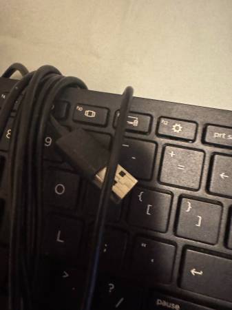 HP USB full-size wired keyboard with number pad. Works perfectly and is plug-and-play with any computer. Great for office, school, gaming, or as a backup keyboard.