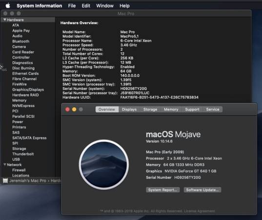 Machine is a late 2009 Mac Pro, so originally a 4.1 machine that has been firmware flashed to a 5.1. It’s currently running macOS Mojave, though it can be updated further, I know Sequoia is possible with the Open Core Legacy Patcher.