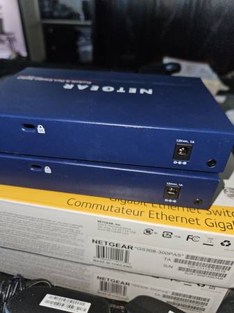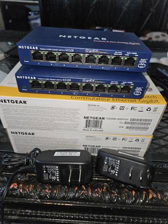 This is a pair of switches that I removed from service recently. They work fine, and they come with the power cord. Model GS-108. CASH ONLY LOCAL ONLY