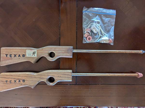 Two wooden pop guns, with extra parts. 21" long. Missing the plastic or metal tubes that serve as the gun barrel and popping mechanism. Two plastic rubber band guns. 15" long. Hold multiple rubber...