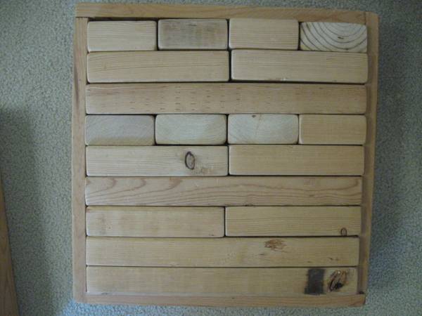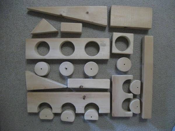 59-piece handmade wooden building block set and two 15"x15" wooden storage boxes. All cut from 2x4 lumber. The longest pieces are 14" long. $35.