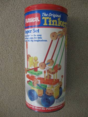 118-piece Playskool 'The Original Tinkertoy' Super Set with real wood rods and spools. Includes instruction book. Ages 3-1/2 and up. Very good condition. $25.
