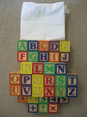 50-piece colorful wooden alphabet block set. Each block is 1.75" by 1.75". All letters of the alphabet plus numbers and symbols. Bag included. Excellent condition. $35.