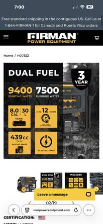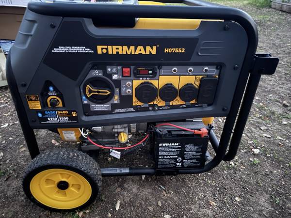 The FIRMAN H07552 Hybrid portable dual fuel generator running off Gasoline or Propane could be the perfect solution. Offering up to 9400 Starting watts and 7500 Running watts, this 459cc powerhouse provides great power with an easy-to-use, fast, and straightforward push button.