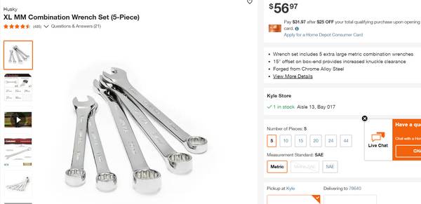 This 5-piece MM set is in like new. I bought them just to remove a large bolt off the front-end suspension. After that, they have never been used again. The set consist of the following wrenches 21,...