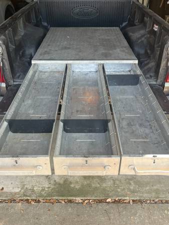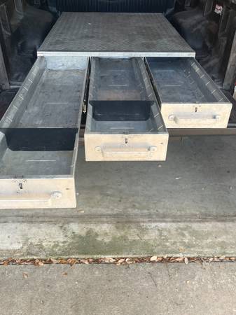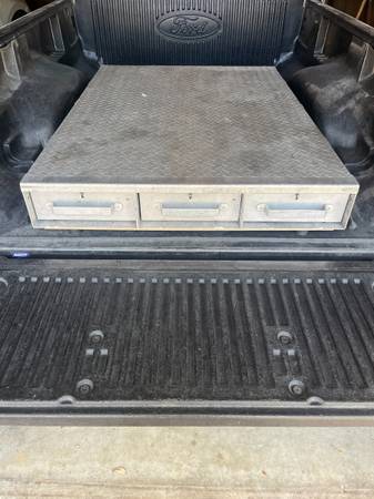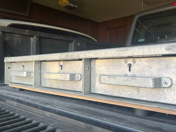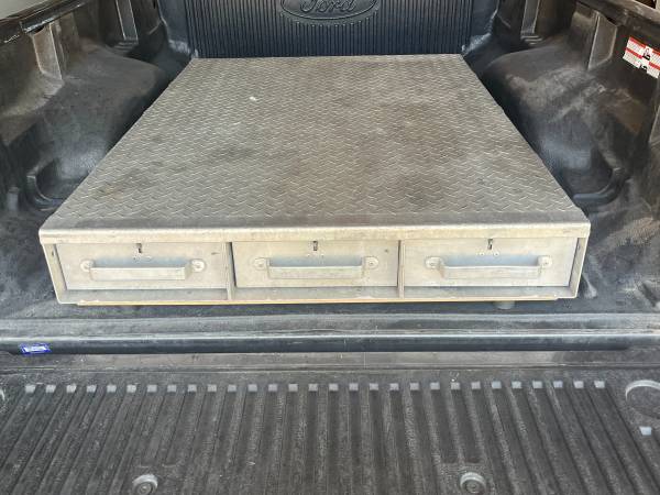 Selling my truck bed tool drawers. These are pretty handy for service vans, small truck, etc. Still works fine, just don't need it anymore. New, these cost 1,500.00-1,600.00. The box itself is 50"X36"X6" and fits in most any small pickup or van. You can bolt it down, but I've never bothered. Once filled, nobody's carrying it off and you can add pad locks to secure the drawers. A locking tailgate would secure it as well.