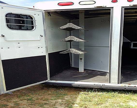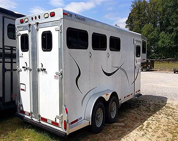 2003 CM 3-horse gooseneck trailer, white, walk-out door at first horse, drop down feed doors on all three stalls, sliding windows at each hip, lined and insulated dressing room roof, folding rear...
