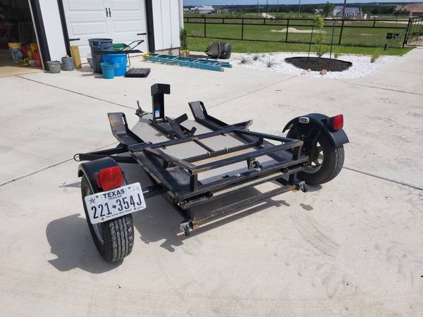 1998 Kendon Motorcycle trailer. It is setup to handle one or two bikes on either or both of the side rails, or a single in the Condor wheel chock, which was added to the trailer. The is a spare tire mounted beneath the trailer. Rated carrying capacity is 2,000 lbs. It is the standup model, which can be placed in a vertical position on wheels to minimize storge space.