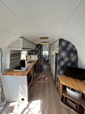 This 1983 31’ vintage Airstream Soverign has been partially remodeled and is ready someone to take her to the next level and on to her first new adventure! Creative handpicked furnishings and decor help define the space, adding to the charm and cheery atmosphere, with ease of use to sleep 4 comfortably. While there are a few details left to be accomplished, they are minor and should be easy to handle for anyone with a bit of DIY know-how and a little love. Professionally installed on-demand propane water heater has been recently added and comes also with portable black water trolley for easy disposal. Come see this gem today; your adventure awaits! Sold As-Is